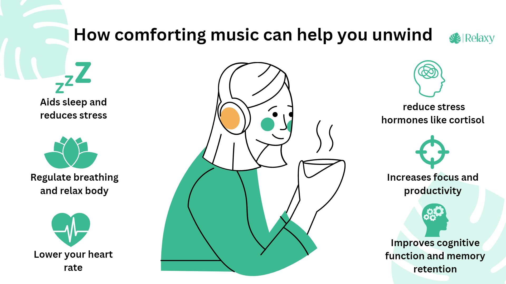 On January 30, 2025Relaxing and calming music has a profound impact on your mental health. It can calm you down, reduce stress and anxiety, and helps you to focus on a single task. Rain, thunder, and other natural noises may be soothing when combined with other types of music, such as light jazz, classical (the “largo” movement), and easy listening.